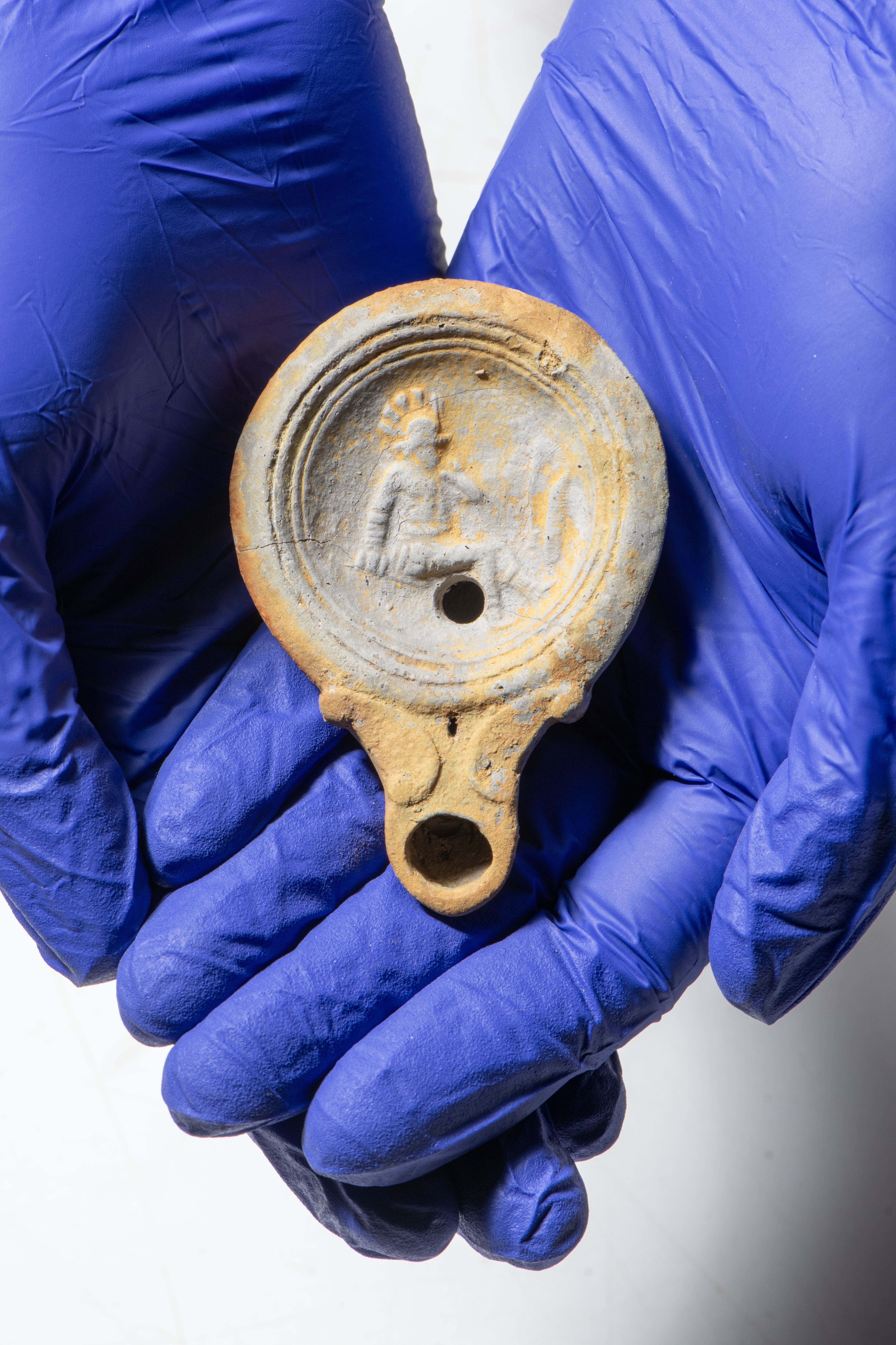 Alongside skeletal remains, archaeologists have found personal objects including beads, a glass vial, and a decorated lamp – which is thought to date to the very early Roman period in Britain c. AD 48-80. Other artefacts accompanying burials in the Roman cemetery include high-status jewellery with jet and amber beads.