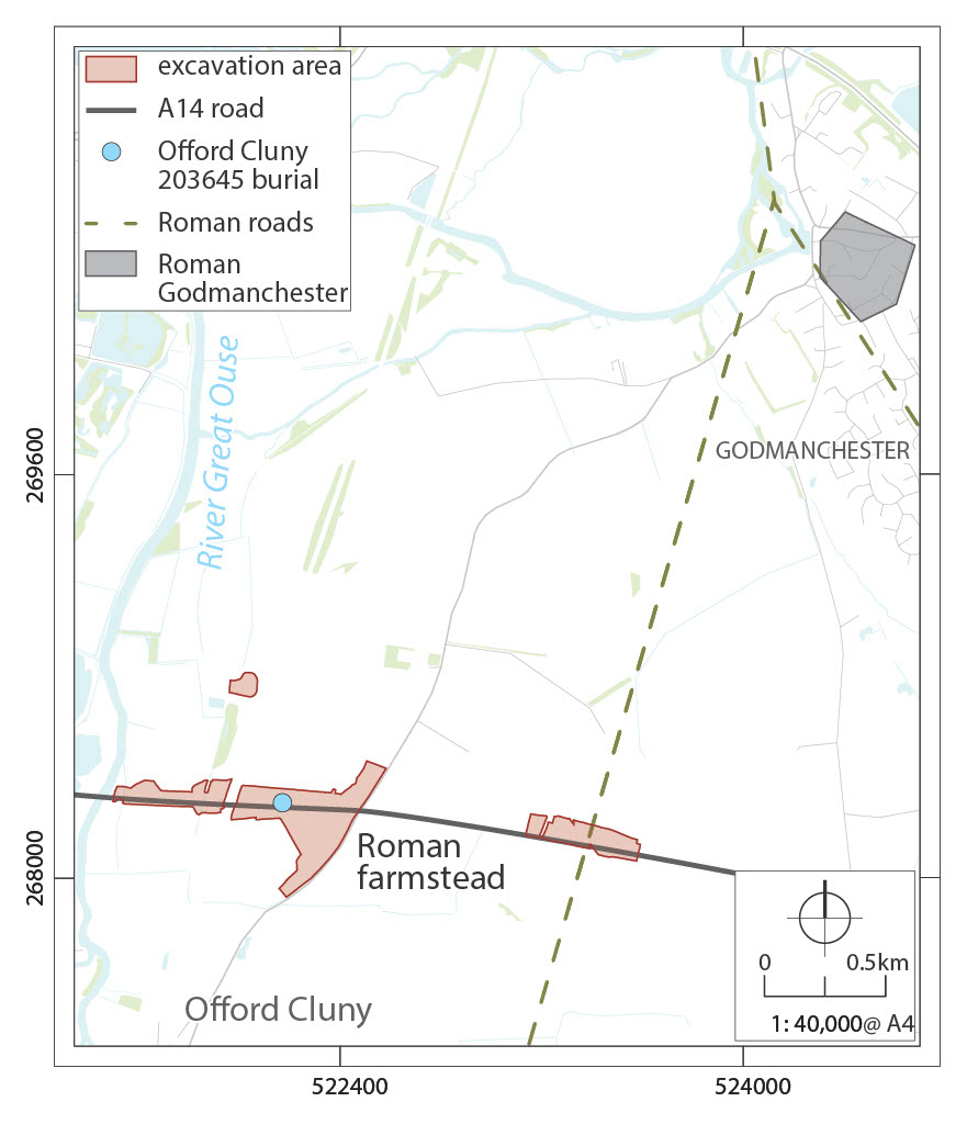 Scientists from the Francis Crick Institute, Durham University, and MOLA Headland Infrastructure have discovered that a man who lived between AD 126-228 during the Roman period did not originally come from a rural farmstead near where he was buried, but likely thousands of miles away, possibly outside of the Roman Empire. His remains were found in 2017 during excavations by MOLA Headland infrastructure near the village of Offord Cluny in Cambridgeshire, as part of the National Highways A14 Cambridge to Huntingdon Improvement Scheme.
